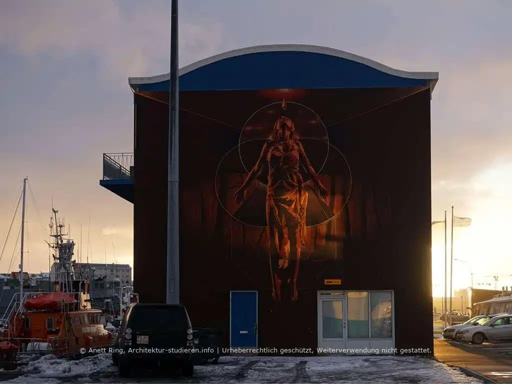 Riesiges Mural des Künstlers D*FACE, das im Rahmen der #wallpoetry beim Iceland-Airwaves-Festival 2015 entstand. Er ließ sich bei diesem Werk von der Laxdæla Saga*, eine der ältesten, längsten und komplexesten Island-Sagas, inspirieren.